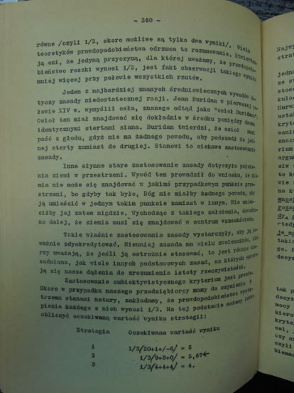 Jednak w książce Witolda Kieżuna "Zagadnienia teorii organizacji i zarządzania", wydanej w 1972 r. przez Zakład Polityki Przemysłowej Wyższej Szkoły Nauk Społecznych przy KC PZPR, znaleźliśmy fragment, który prawdopodobnie związany jest z treścią donosu z 4 lipca 1973 r. Na stronie 260 prof. Kieżun poddał krytyce XIV-wiecznego scholastyka, filozofa i logika, znanego najbardziej z krytyki koncepcji heliocentryzmu, ojca Jeana Buridana w kontekście rozważań na temat decyzyjności i zarządzania: "Jeden z najbardziej znanych średniowiecznych wywodów dotyczy zasady niedostatecznej racji. Jean Buridan w pierwszej połowie XIV wieku wymyślił osła, znanego dotąd jako "osioł Buridana". Osioł ten miał znajdować się dokładnie w środku pomiędzy dwoma identycznymi stertami siana. Buridan twierdzi, że osioł musi paść z głodu, gdyż nie ma żadnego powodu, by poszedł do jednej sterty zamiast do drugiej". Dalej pisze Pan Profesor również o ojcu Buridanie w kontekście jego przywiązania do heliocentryzmu: "Inne słynne stare zastosowanie dotyczyło położenia ziemi w przestrzeni. Wywód ten prowadził do wniosku, że ziemia nie może się znajdować w jakimś przypadkowym punkcie przestrzeni, bo gdyby tak było, Bóg nie miałby żadnego powodu, aby ją umieścić w jednym takim punkcie zamiast w innym. Nie umieściłby jej zatem nigdzie. Wychodząc z takiego założenia, dowodzono dalej, że ziemia musi się znajdować w centrum wszechświata".