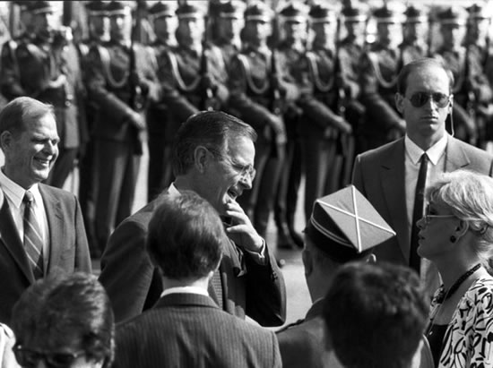 10 czerwca 1989 r. - prezydent USA George Bush przed Grobem Nieznanego Żołnierza w Wraszawie. Po lewej ambasador John Davies