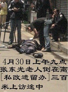 Na zdjęciu leżący na ulicy to 77-letni Zhang Dong-guang, który protestował przez 13 lat przed budynkiem Biura d/s Nieruchomości w mieście Changsha (prowincja Hunan) i zmarł 30 kwietnia. Zdjęcie zostało wykonane przez reporetra Wanga Baifana mimo, że policja zakazała jakkolwiek fotografowania, a ulica była niedostępna dla pieszych i pojazdów przez dwie godziny.