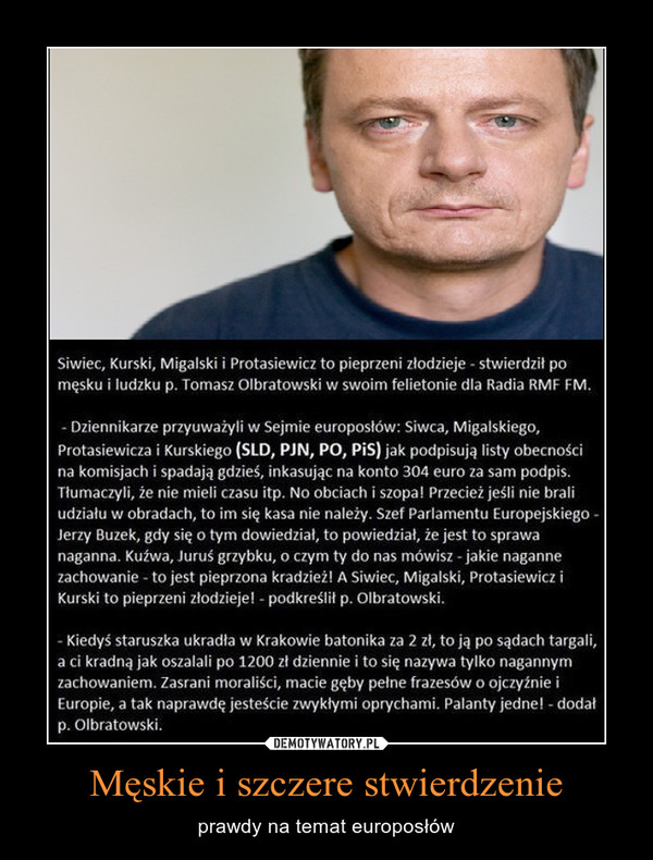 Siwiec, Kurski, Migalski, Protasiewicz (niemal pełne spektrum darmozjadów) to pieprzeni złodzieje stwierdził Tomasz Olbratowski w swoim felietonie dla radia RFM MF. Wymienieni podpisują listę obecności i spadają na pilniejsze zajęcia inkasując na konto po 304 euro za podpis. Dla Buzka, szefa europarlamentu to sprawa naganna, a staruszka w Krakowie za kradzież batonika za 2 zeta po sądach III RP jest targana!